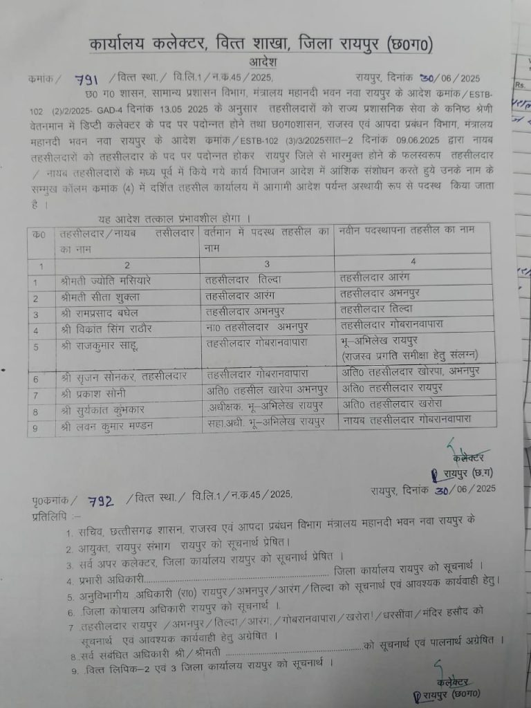 Chhattisgarh | 9 tehsildars transferred in Raipur district, collector issued order