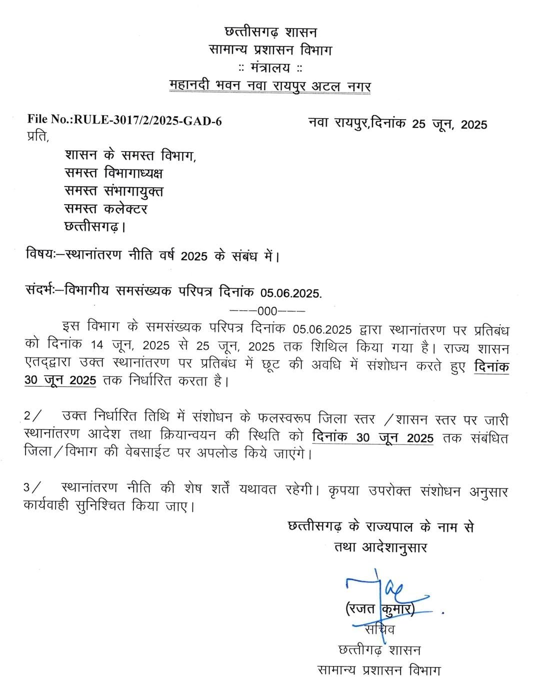 नवा रायपुर, 25 जून 2025। छत्तीसगढ़ शासन के सामान्य प्रशासन विभाग ने आज एक नया आदेश जारी कर स्थानांतरण नीति वर्ष 2025 से संबंधित महत्वपूर्ण संशोधन किया है।
