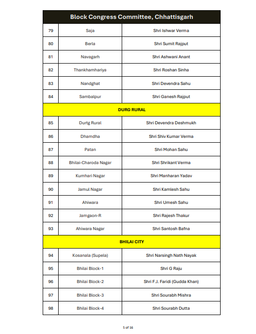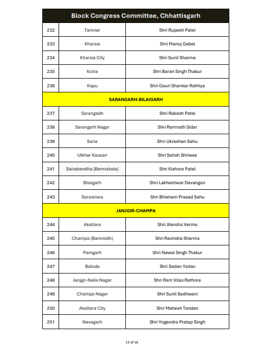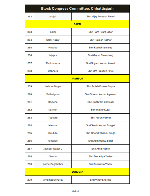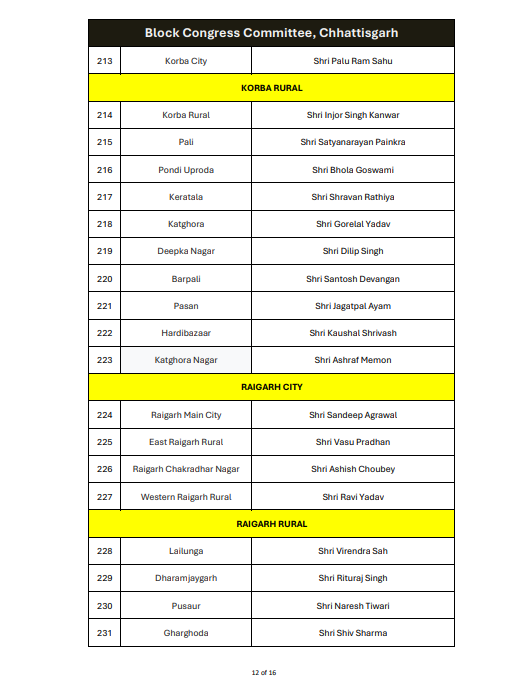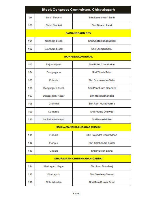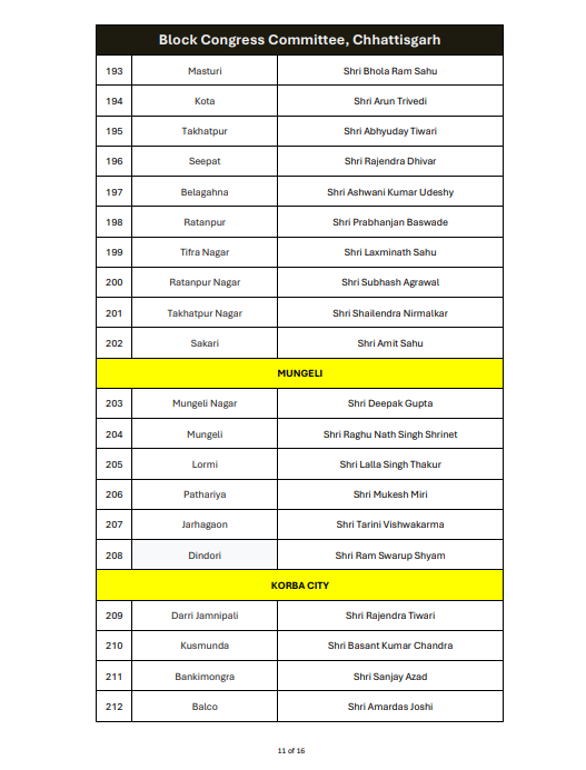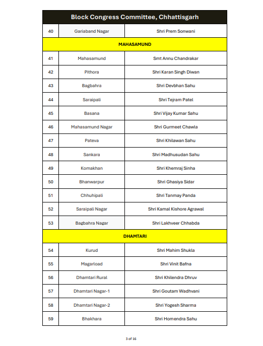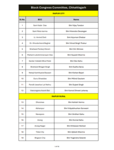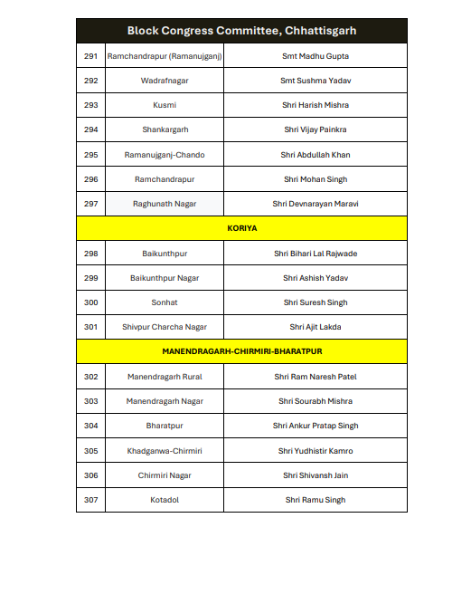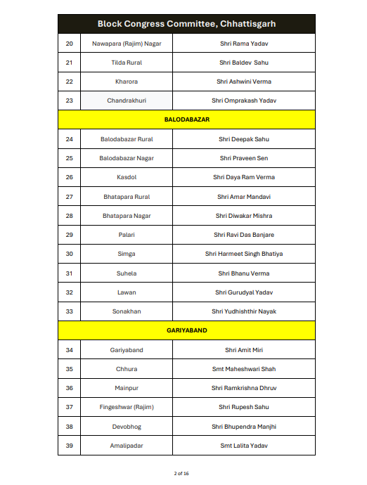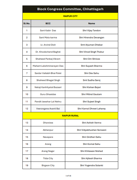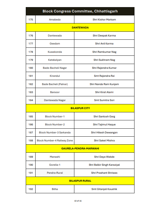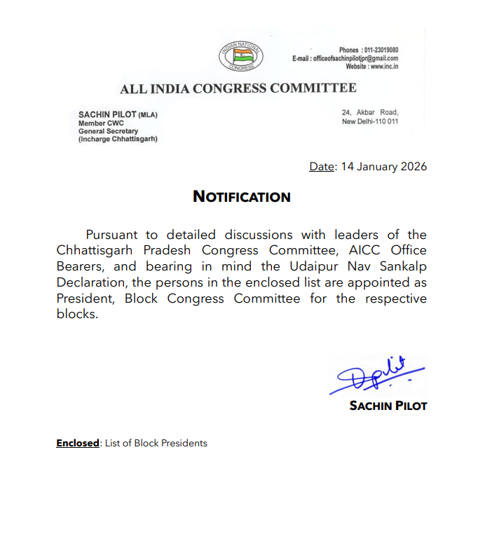 रायपुर। ऑल इंडिया कांग्रेस कमेटी ने छत्तीसगढ़ में ब्लॉक कांग्रेस कमेटी अध्यक्षों की नियुक्ति को लेकर अधिसूचना जारी कर दी है। यह आदेश 14 जनवरी 2026 को जारी किया गया है, जिस पर एआईसीसी के महासचिव और छत्तीसगढ़ प्रभारी सचिन पायलट के हस्ताक्षर हैं।