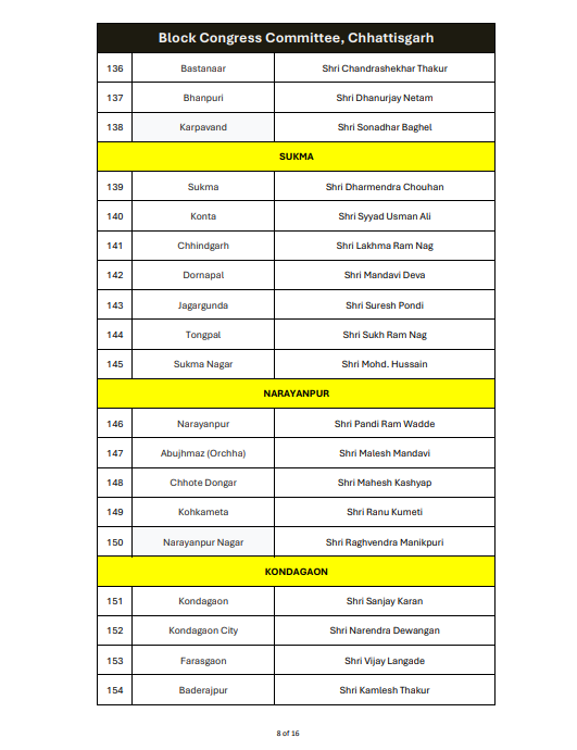 अधिसूचना में कहा गया है कि छत्तीसगढ़ प्रदेश कांग्रेस कमेटी के नेताओं और एआईसीसी पदाधिकारियों के साथ विस्तृत चर्चा के बाद, उदयपुर नव संकल्प घोषणा को ध्यान में रखते हुए संबंधित ब्लॉकों के लिए ब्लॉक कांग्रेस कमेटी के अध्यक्ष नियुक्त किए गए हैं। नियुक्त ब्लॉक अध्यक्षों की सूची अधिसूचना के साथ संलग्न की गई है।