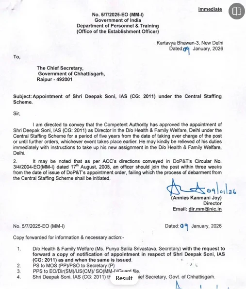 केंद्र सरकार ने इस संबंध में आदेश जारी करते हुए छत्तीसगढ़ के मुख्य सचिव को पत्र लिखकर दीपक सोनी को तत्काल प्रभाव से रिलीव करने के निर्देश दिए हैं। औपचारिक प्रक्रिया पूरी होते ही वे जल्द ही दिल्ली में पदभार संभालेंगे।