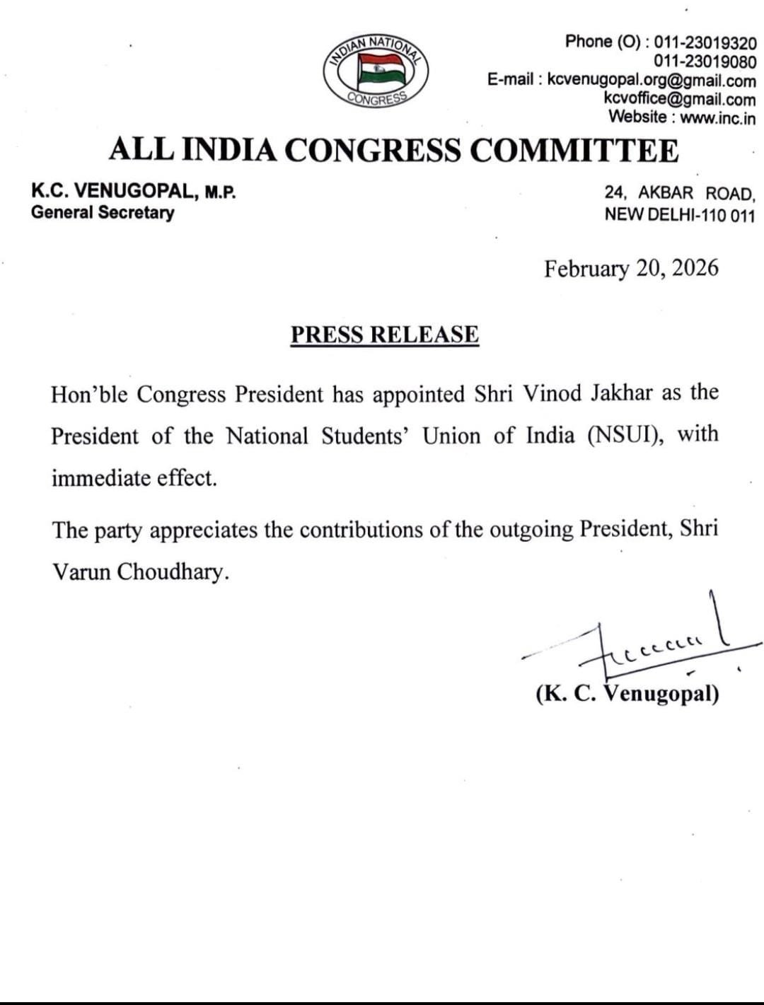 Congress Breaking | Vinod Jakhar becomes NSUI National President