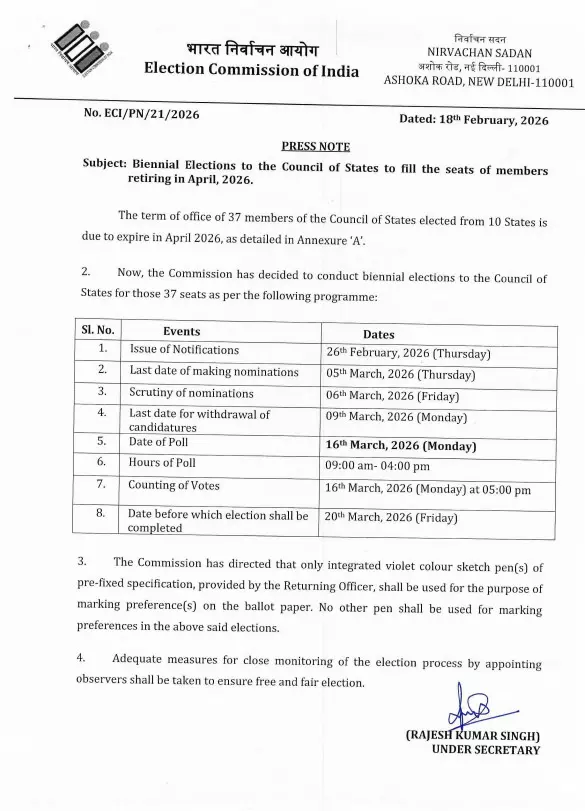 जारी अधिसूचना के मुताबिक चुनाव की प्रक्रिया 26 फरवरी 2026 से शुरू होगी। इसी दिन नोटिफिकेशन जारी किया जाएगा। उम्मीदवार 5 मार्च 2026 तक नामांकन दाखिल कर सकेंगे। 6 मार्च को नामांकन पत्रों की जांच होगी, जबकि 9 मार्च 2026 तक नाम वापस लिए जा सकेंगे।